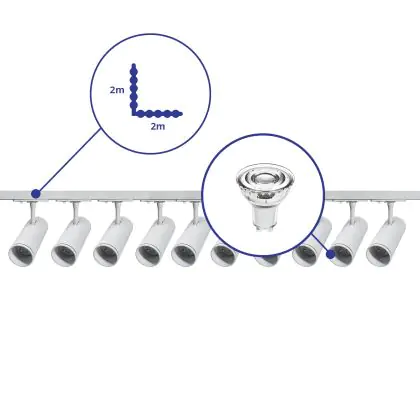 Beschreibung Komplettset 1-Phasen Rail L 2 x 2 Meter Weiß | incl. 10x Spot + GU10 2700K 3W Dimmbar + Abschlusskappe, Stromanschluss und L -Verbinder