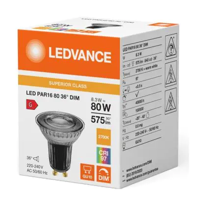 Die Ledvance LED PAR16 GU10 Reflektor 8.3W 575lm 36D - 927 Extra Warmweiß | Höchste Farbwiedergabe - Dimmbar - Ersatz Für 80W ist eine effiziente GU10 LED-Lampe und der perfekte Ersatz für Ihre konventionelle Halogenlampe mit 80W und einem GU10-Sockel, bei welchem die zwei Stifte einen Abstand von 10 mm zueinander haben. Zudem strahlt das Produkt Licht in der Farbtemperatur 2700K - Extra Warmweiß aus und punktet durch eine lange Lebensdauer.