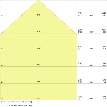 Beispiel: Wird eine Lampe mit einem Abstrahlwinkel von 60 Grad an der Decke (2,5 m Höhe) angebracht, erzeugt sie einen Lichtkegel von 2,9 Metern Durchmesser. Hat die Lampe hingegen einen Abstrahlwinkel von 120 Grad, beträgt der Lichtkegel 8,7 Meter im Durchmesser. |