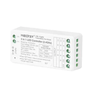 Der MiLight / MiBoxer LED Controller 3in1 (FUT037S+) ist eine vielseitige Steuerungslösung für mehrfarbige LED-Streifen mit gemeinsamen Kathodenanschluss. Er unterstützt RGB (4-polig), RGBW (5-polig) und RGBWW/RGBCCT (6-polig) und ist mit allen MiBoxer / Mi-Light Fernbedienungen kompatibel.