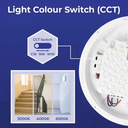 2. CCT: Sie wählen über einen Schalter aus 2 oder 3 festen Farben aus, z. B. Warmweiß oder Kaltweiß.