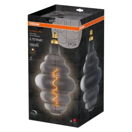 Die Osram Vintage 1906 LED E27 Special Filament Smokey 4.8W 100lm - 818 Extra Warm White | Dimmable ist eine effiziente E27 LED-Lampe mit Retrodesign und der perfekte Ersatz für Ihre konventionellen 10W Lampen mit E27. Zudem strahlt sie Licht in der Farbtemperatur 1800K - Extra Warmweiß aus und punktet durch eine lange Lebensdauer.