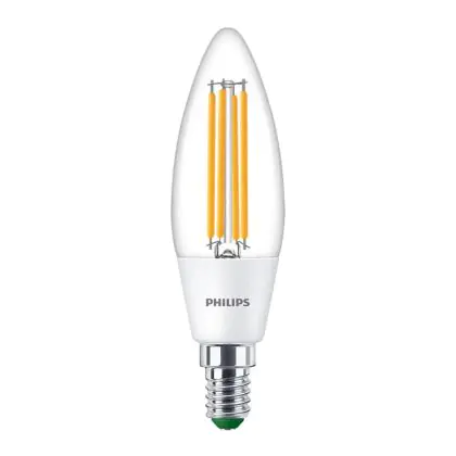 Die Philips MASTER LED Kerze E14 Fadenlampe Klar 2.3W 485lm - 830 Warmweiß | Ersatz für 40W ist eine effiziente E14 LED-Lampe mit Retrodesign und der perfekte Ersatz für Ihre konventionellen 40W Lampen mit E14. Zudem strahlt sie Licht in der Farbtemperatur 3000K - Warmweiß aus und punktet durch eine lange Lebensdauer.